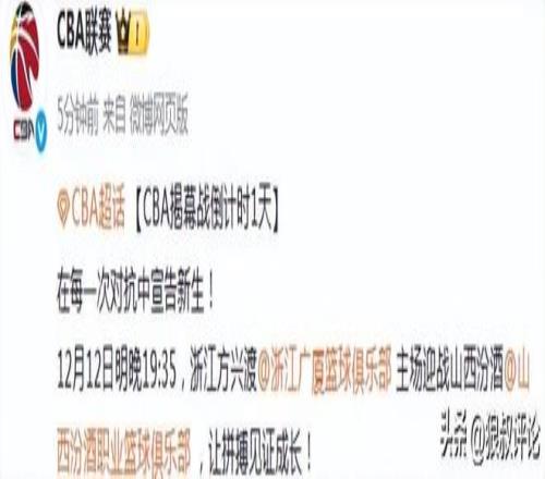 北京时间12月11日,根据CBA官方的公示,CBA揭幕战倒计时1天,12月12日明晚19:35,浙江方兴渡主场迎战山西汾酒,让拼搏见证成长。
